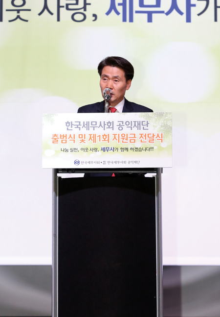 저는 오늘 한국세무사회 공익재단 출범식을 맞이하여 지난 52년 동안 세무사제도와 한국세무사회 발전을 위하여 지원해주신 정부와 국회의원님들을 비롯한 많은 분들께 1만여 회원을 대표하여 ‘진심으로 감사드립니다’라는 말씀을 올립니다.