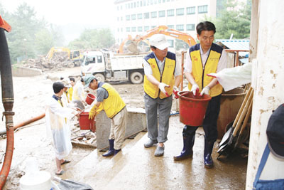 피해를 입은 우면산 수해지역을 찾아가 수해복구 활동을 벌이고 있다.