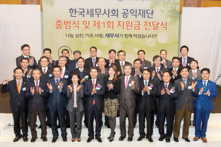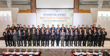 ▲ 한국세무사회공익재단 출범식 및 제1회 지원금 전달식에서는 제정부 법제처장 등 정부고위관계자와 21명의 국회의원이 참석해 자리를 빛냈다. 앞줄 왼쪽 세번째 부터 이종훈(새누리당), 이윤석(민주당), 유승희(민주당), 정성호(민주당), 이한성(새누리당), 조정식(민주당), 이용섭(민주당), 김진표(민주당) 의원, 정구정 회장, 오제세(민주당), 나성린(새누리당), 최봉홍(새누리당), 이만우(새누리당), 이완영(새누리당) 의원, 추경호 기획재정부 차관이다. 뒷줄 오른쪽에서 여섯번째가 이전환 국세청 차장, 여덟번째가 제정부 법제처장이다.