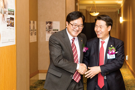 ▲ 정구정 회장과 우원식 의원(민주당 최고위원)이 반갑게 인사를 나누며 환담장으로 걸어가고 있다.