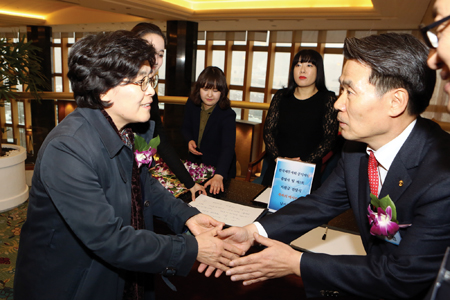 ▲ 정구정 회장이 환담장에 입장하고 있는 유승희 의원을 만나 반갑게 인사를 나누고 있다.