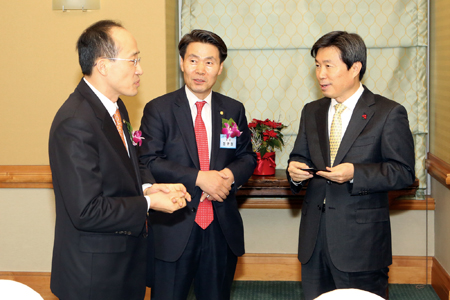 ▲ 정구정 회장과 오제세 보건복지위원장과, 유승희 의원이 환담을 나누며 행사장으로 입장하고 있다. 이용섭, 김진표, 나성린 의원, 제정부 법제처장, 추경호 차관이 그 뒤를 있고 있다.
