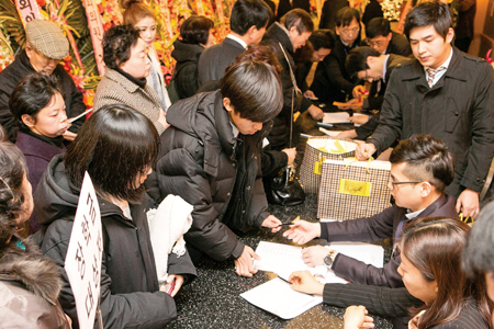 ▲ 지원대상자들이 전달식에 앞서 등록을 하고 있는 모습. 이날 참석한 지원금 수여자들에게 여비가 지급됐다.