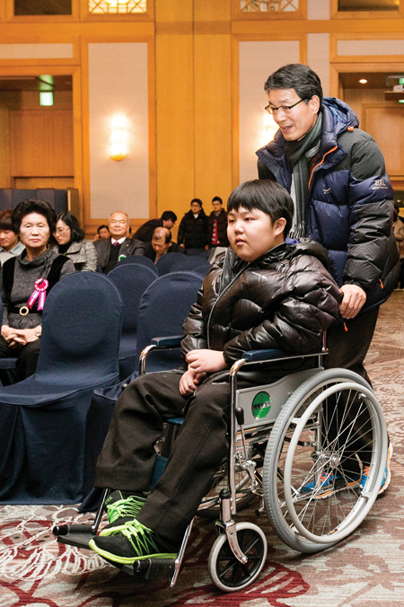 ▲ 휠체어를 탄 학생이 지원금을 받기 위해 행사장으로 입장하고 있다.