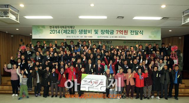 아주경제 김동욱 기자 =한국세무사회(회장 정구정)는 10일 오후 2시 서초동 세무사회관에서 한국세무사회공익재단 제2회 생활비 및 장학금 전달식을 열고 보건복지부가 정한 지원규정에 따라 선정된 형편이 어려운 가정과 자녀 901명에게 생활비와 장학금으로 7억원을 전달했다고 밝혔다.