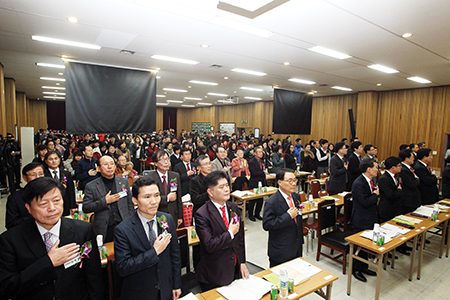 ≪ 한국세무사회공익재단 2014(제2회) 생활비 및 장학금 전달식에 앞서 참석자 전원이 일어나 국민의례를 하고 있다.