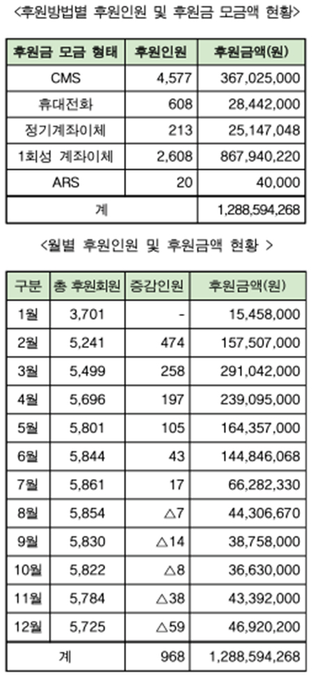 후원회원 모집 5천861명 정점으로 매월 15~60명씩 후원회원 감소