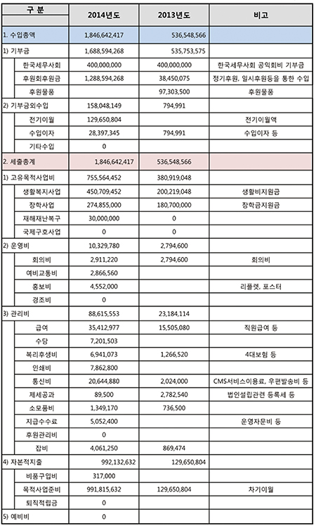 정기후원과 일시후원을 통해 모금된 12억8000여만원의 후원금과 회원들이 연간 4만원씩 납부하고 있는 공익회비 4억원을 포함해 2014년 한 해 동안 총 16억8859만4268원의 후원금이 모이게 된 것이다.