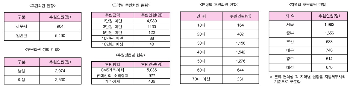 후원회원을 지역별로 분류했을 때에는 세무사회원들의 지역별 분포와 비슷한 결과를 보였다. 회원들이 가장 많이 포진해있는 서울과 중부지역이 각각 1천982명과 1천656명으로 후원회원의 58%를 차지해 가장 많은 후원회원을 보유하고 있었으며, 대구 746명, 부산 688명, 대전 670명, 광주 514명으로 나머지 42%를 차지해 각 지방회 회원 수와 비슷한 수치를 기록했다.