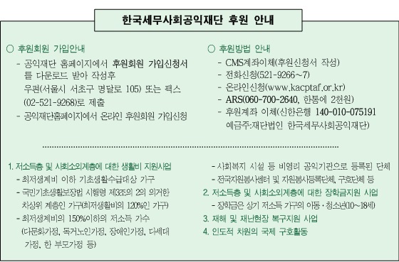 한편 재단법인 한국세무사회공익재단은 사회공헌활동에 동참할 정기 후원회원을 모집중에 있다.