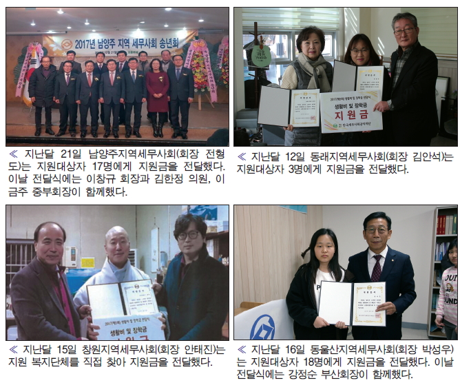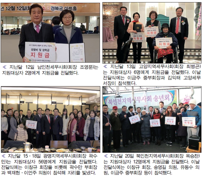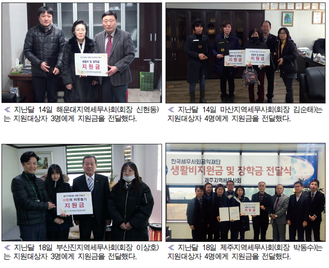 어려운 이웃에게 따뜻한 온정을 전하기 위해 지난해 12월 12일 시작된 한국세무사회공익재단의 ‘2017(제5회) 생활비 및 장학금 전달식’이 지난달 28일 구로지역세무사회 전달식을 마지막으로 마무리됐다.