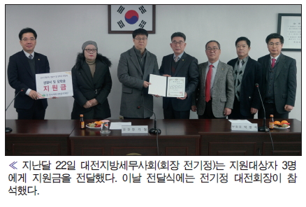 전국 35곳의 지방회 및 지역세무사회에서 개최된 이번 지원금 전달식에서는 총 320여명의 지원대상자에게 지원금 및 장학금을 전달했다.