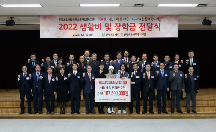 한국세무사회(회장 원경희)의 이웃사랑은 올해도 계속되고 있다. 한국세무사회는 한국세무사회공익재단(이사장 정구정)과 공동으로 13일 서초동 한국세무사회관에서 ‘2022년도 제10회 한국세무사회공익재단 생활비 및 장학금 전달식’을 가졌다.