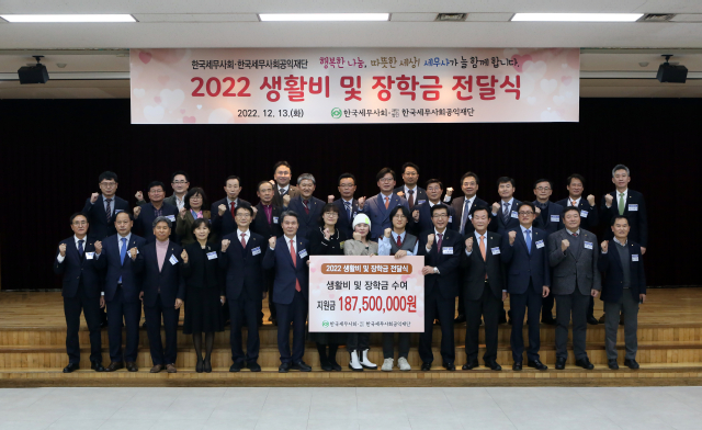 한국세무사회(회장: 원경희)는 한국세무사회공익재단(이사장: 정구정)과 공동으로 지난 13일 회관 6층 대강당에서 '2022년 제10회 한국세무사회공익재단 생활비 및 장학금 전달식'을 개최했다.